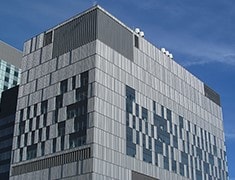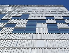 The designer can “create” a new ribbed profile: straight, square, rectangle, angled, double-angled, multi-angled and or multiple depths. This covering is offered in D-MAX pre-painted aluminium which is a special aluminium alloy designed with high mechanical stability as well as high resistance to salty air; PVDF type Kynar 500-70% finishes such as Duranar XL; comes with a 30 year guarantee.